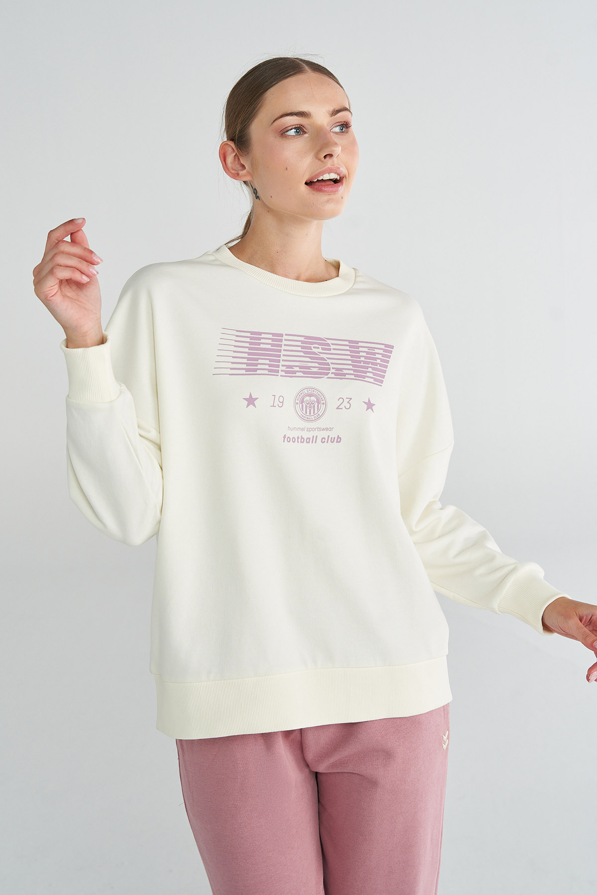 Ekru kadın PALMER Sweatshirt, hummel futbol kulübü logosuyla öne çıkan oversize kesimi ve rahat bisiklet yakasıyla spor şıklığını bir araya getiriyor. Nefes alabilir yapısı ve uzun kollu tasarımıyla hem antrenman öncesi ve sonrası hem de günlük kombinlerde konforlu bir kullanım sunuyor. Üzerindeki artwork baskı detayları sayesinde sade ama etkileyici bir stil yaratırken, sportif gardırobunuza şık bir dokunuş katıyor.