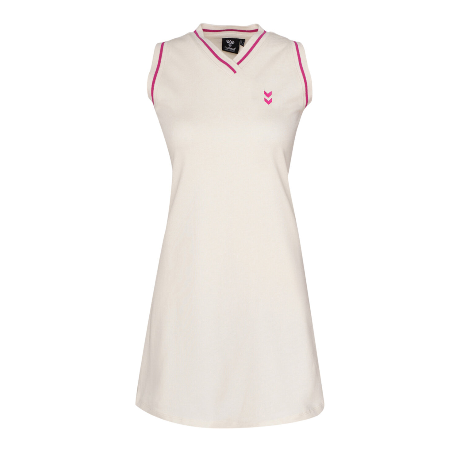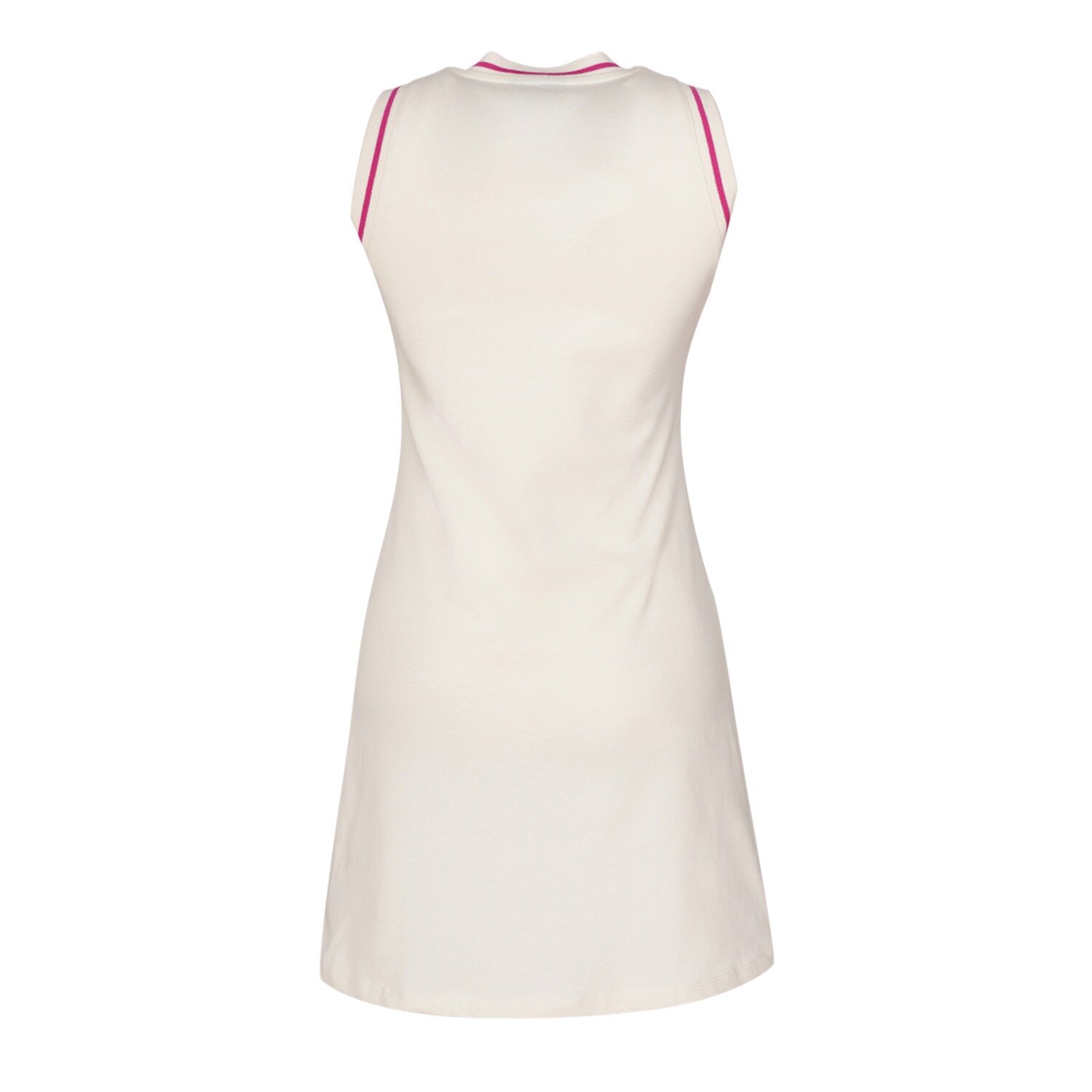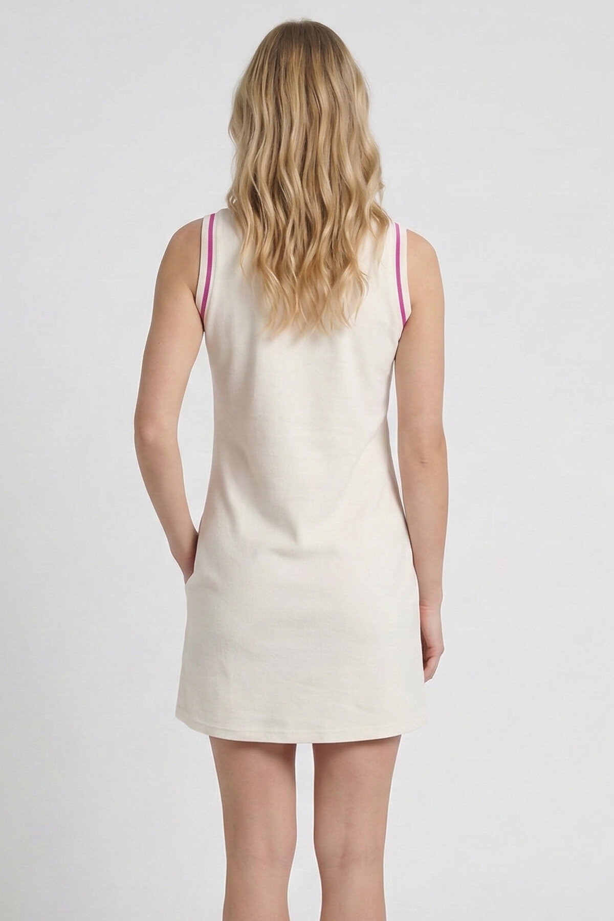 Ekru kadın REGALO ELBİSE, sportif ve şık tasarımıyla günlük kullanım için ideal bir seçenektir. Hafif ve yumuşak dokusu, gün boyu konfor sağlar. V yaka ve kolsuz tasarımı, hareket özgürlüğünü artırırken diz üstü boyu modern ve rahat bir kullanım sunar. Kol ve yaka triko bant detayları, tasarıma şık bir dokunuş ekler. Şevron baskı detayı ise elbiseye minimal bir sportif vurgu kazandırır.